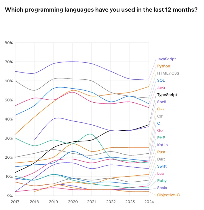 If you’re still trying to decide. Let me share some cold hard facts. Every year, TypeScript continues to gain popularity. (Taken from the State of Developer Ecosystem Report.)